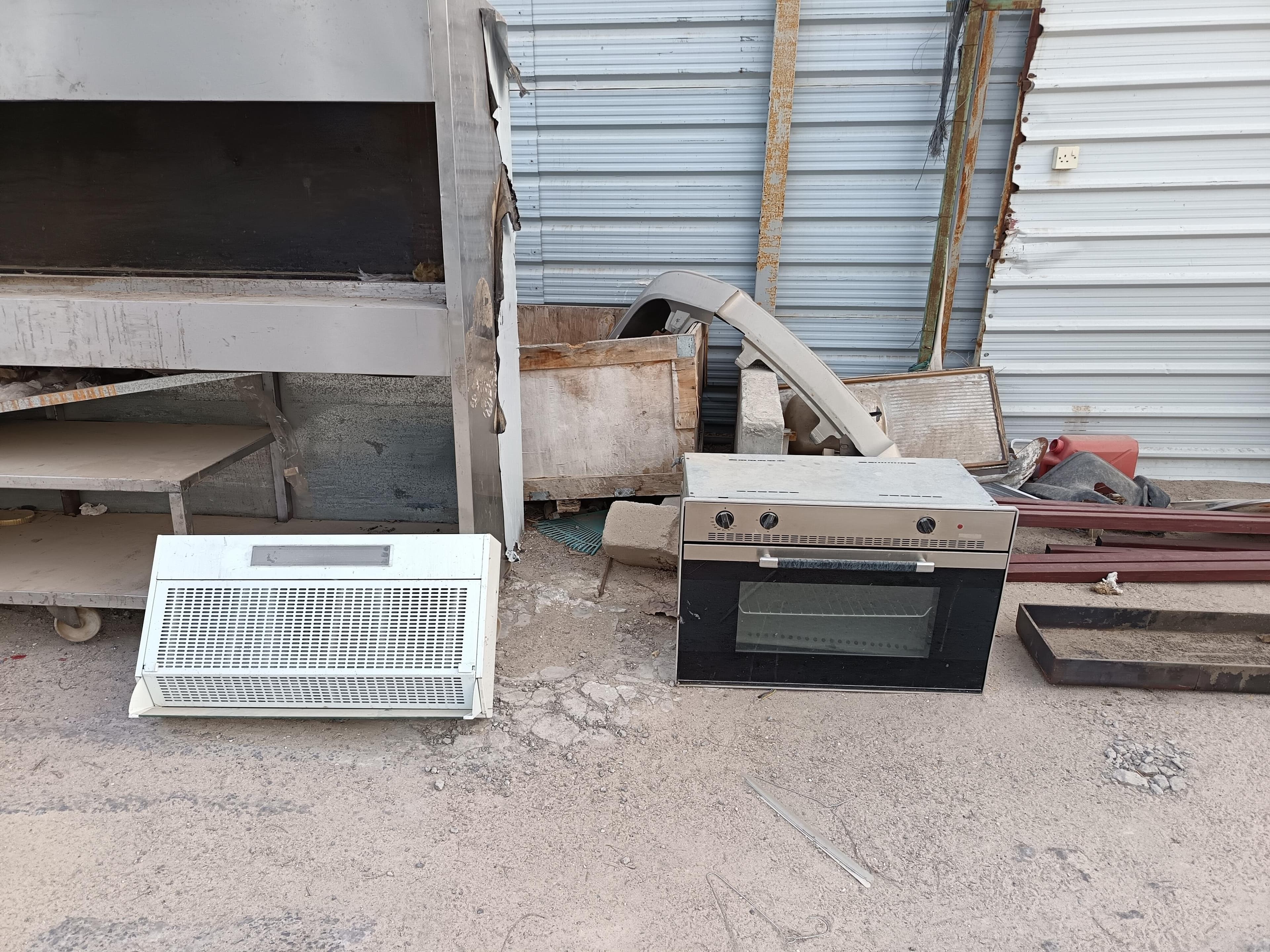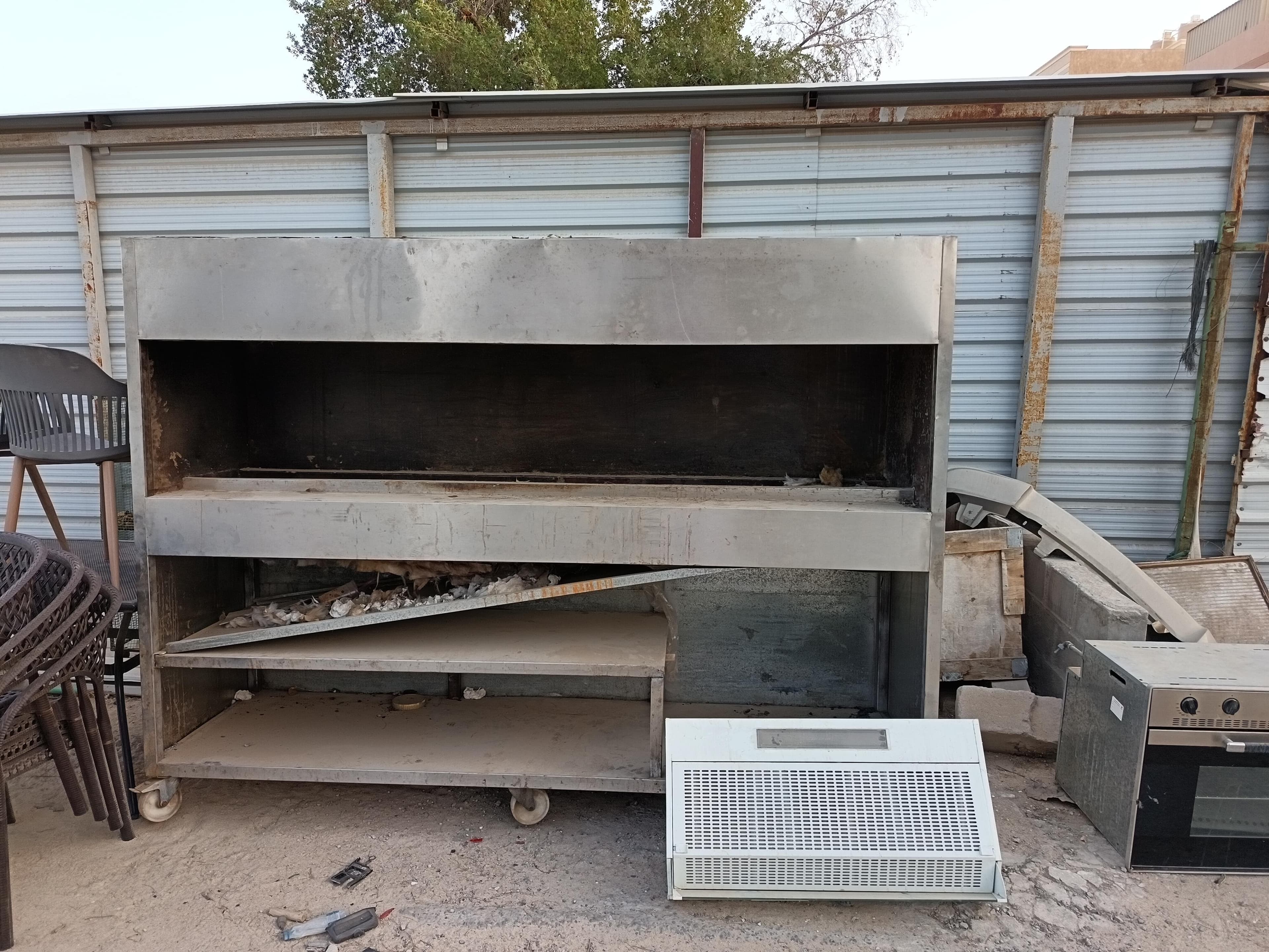 شواية فحم متنقلة على عجلات حجم كبير فرن كهربائي مكينة شفط دخان 3 طاولات حديد 12 كرسي.